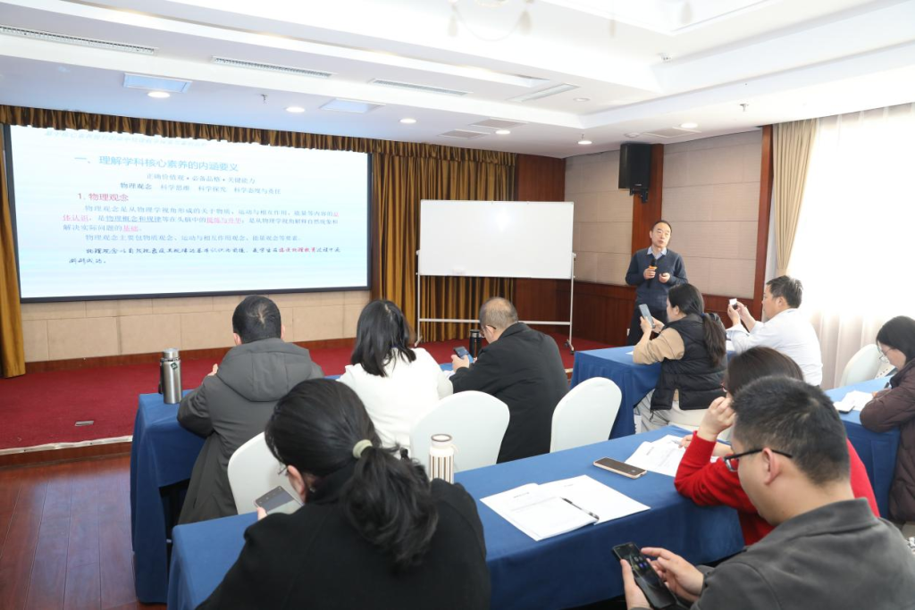春寒料峭,学意正浓。2月25日上午,山东省高中物理卓越师资培育项目研修进入第二日。山东省教育科学研究院物理教研员、正高级教师、特级教师王宪收老师,为学员们带来了题为《基于提升核心素养的高中物理教学探索与案例剖析》的专题报告。报告从理论到实践,系统阐述了核心素养落地的课堂教学路径。